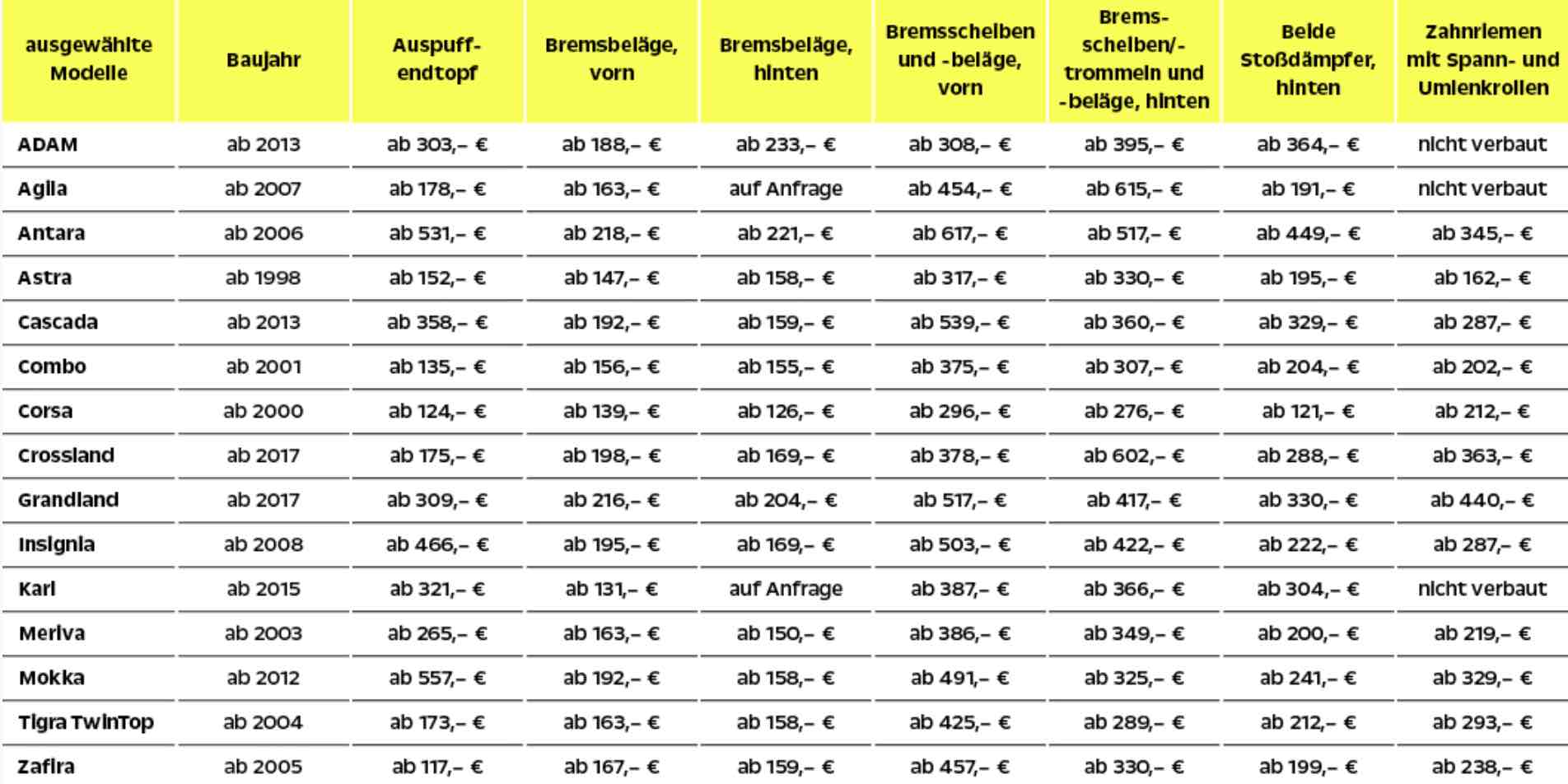 1 Preis je nach Modell und Motorisierung. Alle Preise sind Komplettpreise inklusive MWst. in Euro inklusive Teile und Lohn.